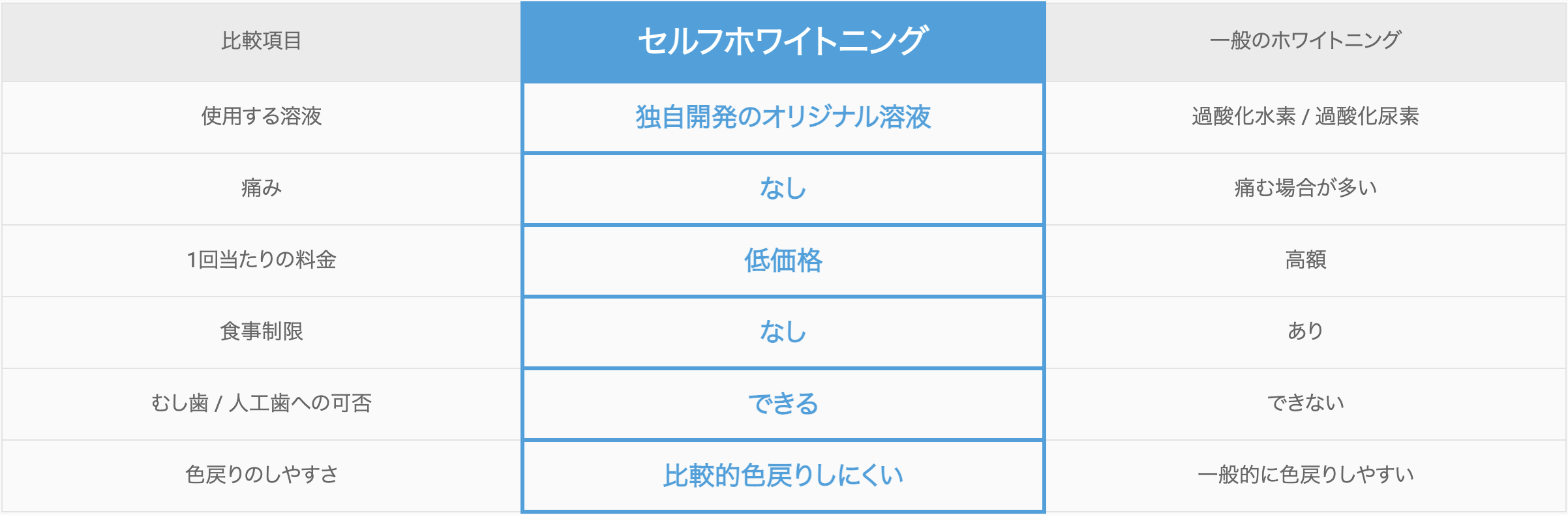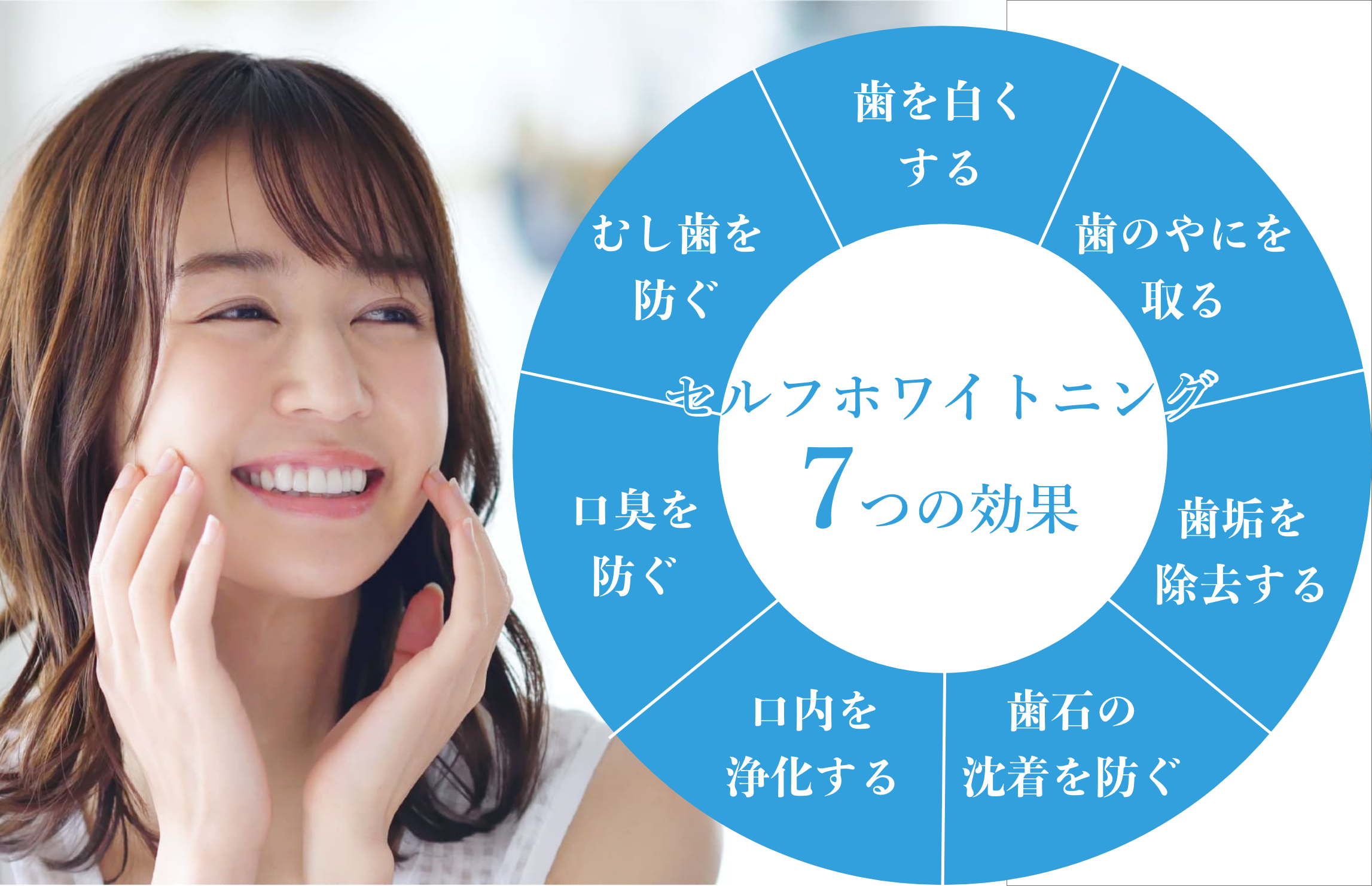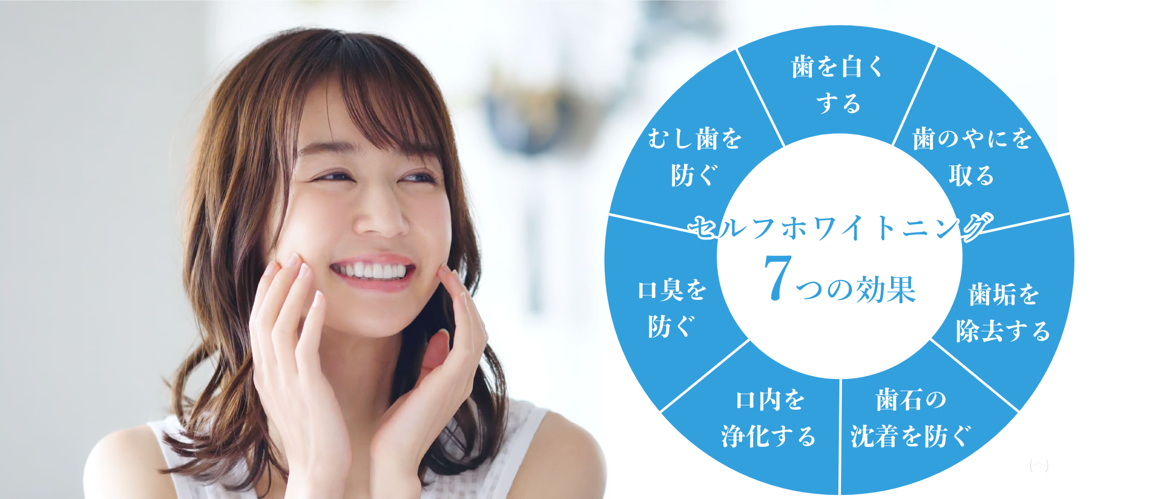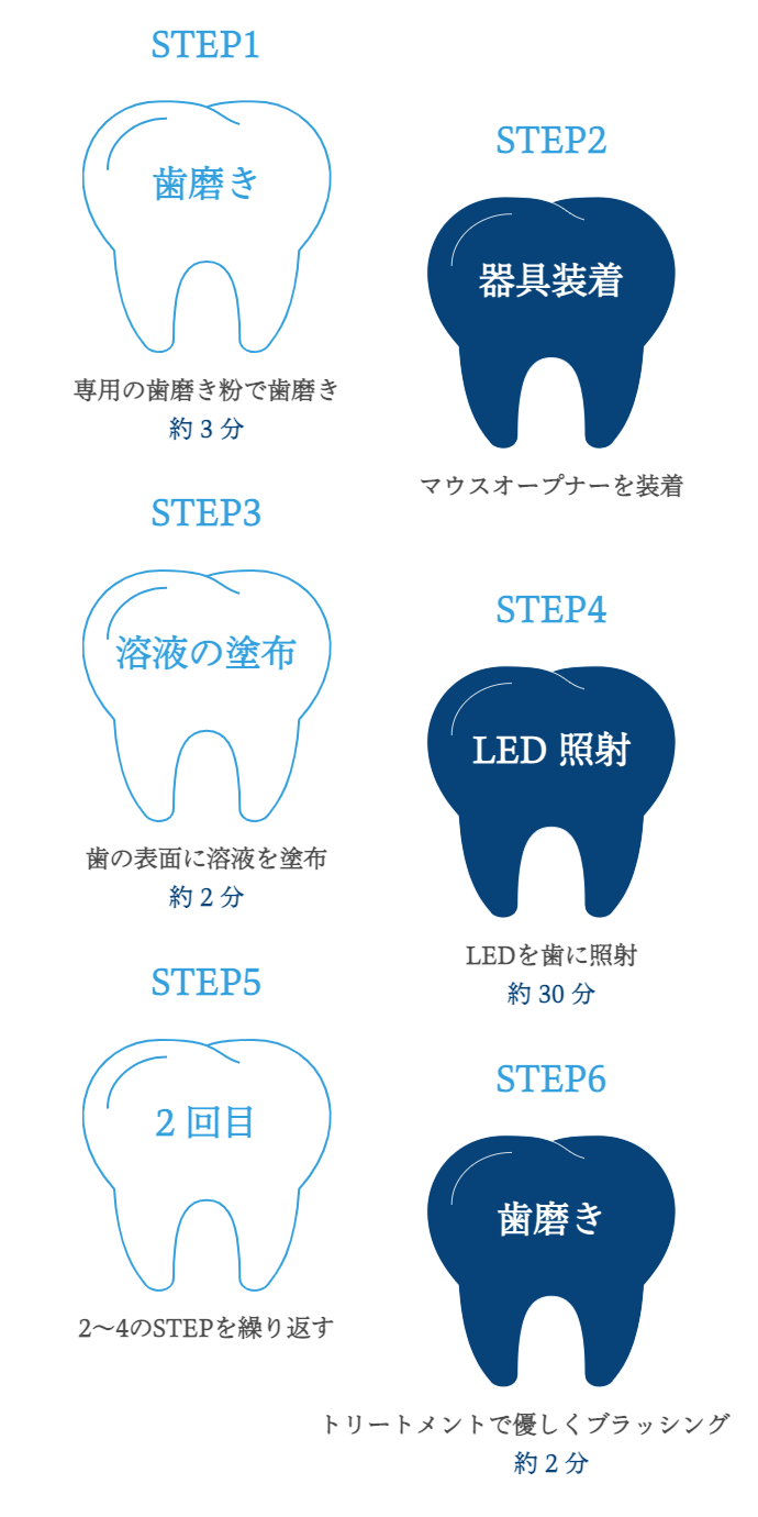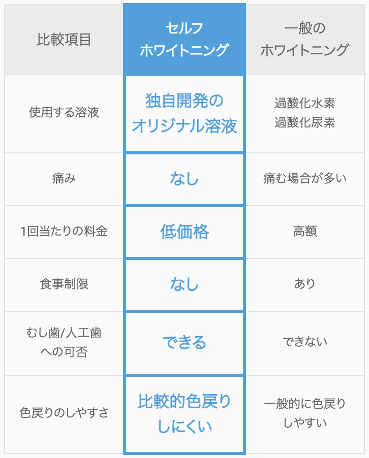 セルフホワイトニングってなに? セルフホワイトニングとは従来のオフィスホワイトニングで使用されている過酸化水素を使用せずに 歯が本来持つ白さを取り戻すホワイトニングです。 また、従来のホワイトニングに比べご自身で施術が可能な為、 「低価格」「短時間」「痛くない」など様々なメリットがあります。 セルフホワイトニングにはどんな効果がある? 歯の表面には、それまでの日常生活・食生活の中で蓄積した汚れ『ステイン』が付着しています。 このステインが歯のくすんだ色の原因です。 セルフホワイトニングでこの汚れを落とします。 その後、歯ブラシで歯の表面をブラッシングをすることで 歯を自然な白さに近づけます。 セルフホワイトニングと従来のホワイトニングの比較 セルフホワイトニングの流れ